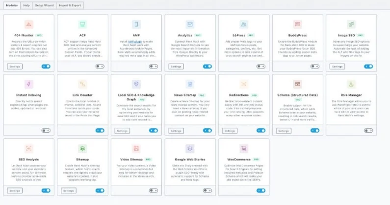 In het Dashboard kun je de verschillende mogelijkheden van Rank Math controleren in een handig overzicht. Wat je niet nodig hebt kun je gewoon uitzetten. Via de tabjes in het dashboard kun je ook altijd terug naar de set-up Wizard of de documentatie raadplegen.