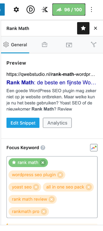 Rank Math geeft een soort ‘ranking’ aan in een % van 100, wat ik zelf zeer prettig vind. Het is wat nauwkeuriger dan alleen maar kleurcodes.